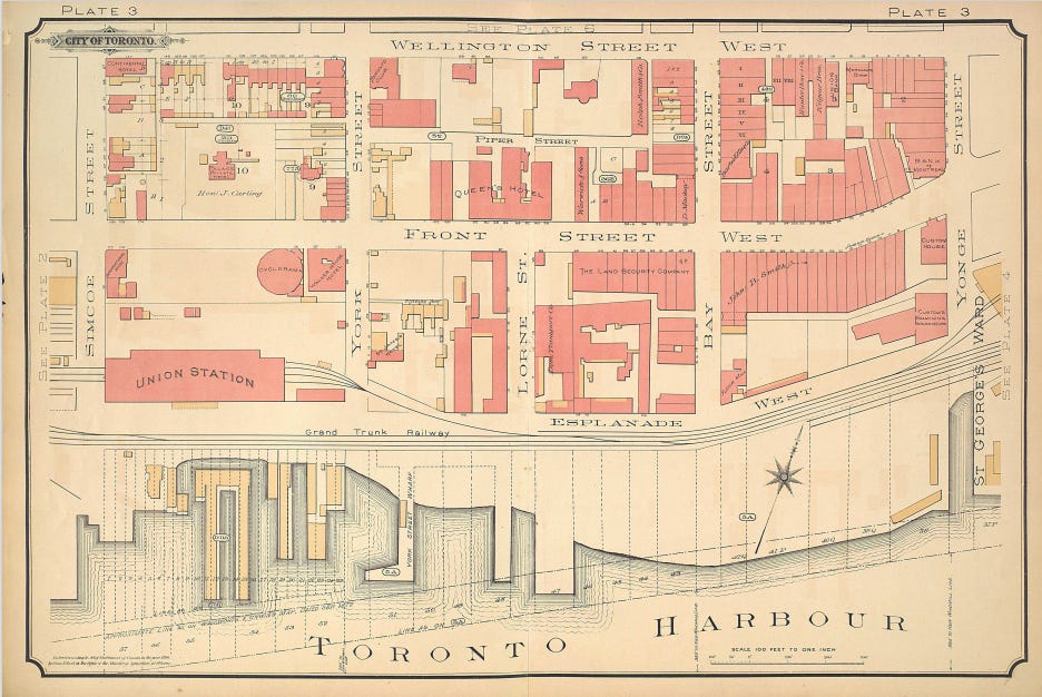 What Goad lacks in biography, he makes up for in maps. His firm had surveyed 340 Canadian towns and cities by the year 1885, and that year, Goad relocated to London and begin a British chapter of his fire insurance business.7 The company surveyed many cities within the Empire—Alexandria, Cape Town, Port of Spain—and some outside it.8 Each map was hand-coloured by Goad’s staff with the same pinks, yellows, oranges, and blues.9