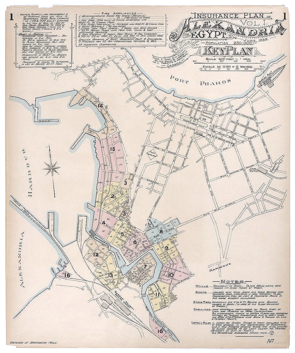 Insurance Plan of Alexandria, Egypt. 2 vols., 26 maps. London: Chas. E. Goad, 1898–1905. Fire insurance maps. American University in Cairo, Digital Collections. https://digitalcollections.aucegypt.edu/digital/collection/p15795coll6/id/74; Charles E. Goad, Insurance Plan of London, vol. 1, sheet 10 (London: Chas. E. Goad, [late 19th century]), British Library shelfmark BL 152434, accessed via Wikimedia Commons; Charles E. Goad, Egypt. Alexandria. Key Plan (London: Chas. E. Goad, [late 19th–early 20th century]), accessed via Gallica, Bibliothèque nationale de France.