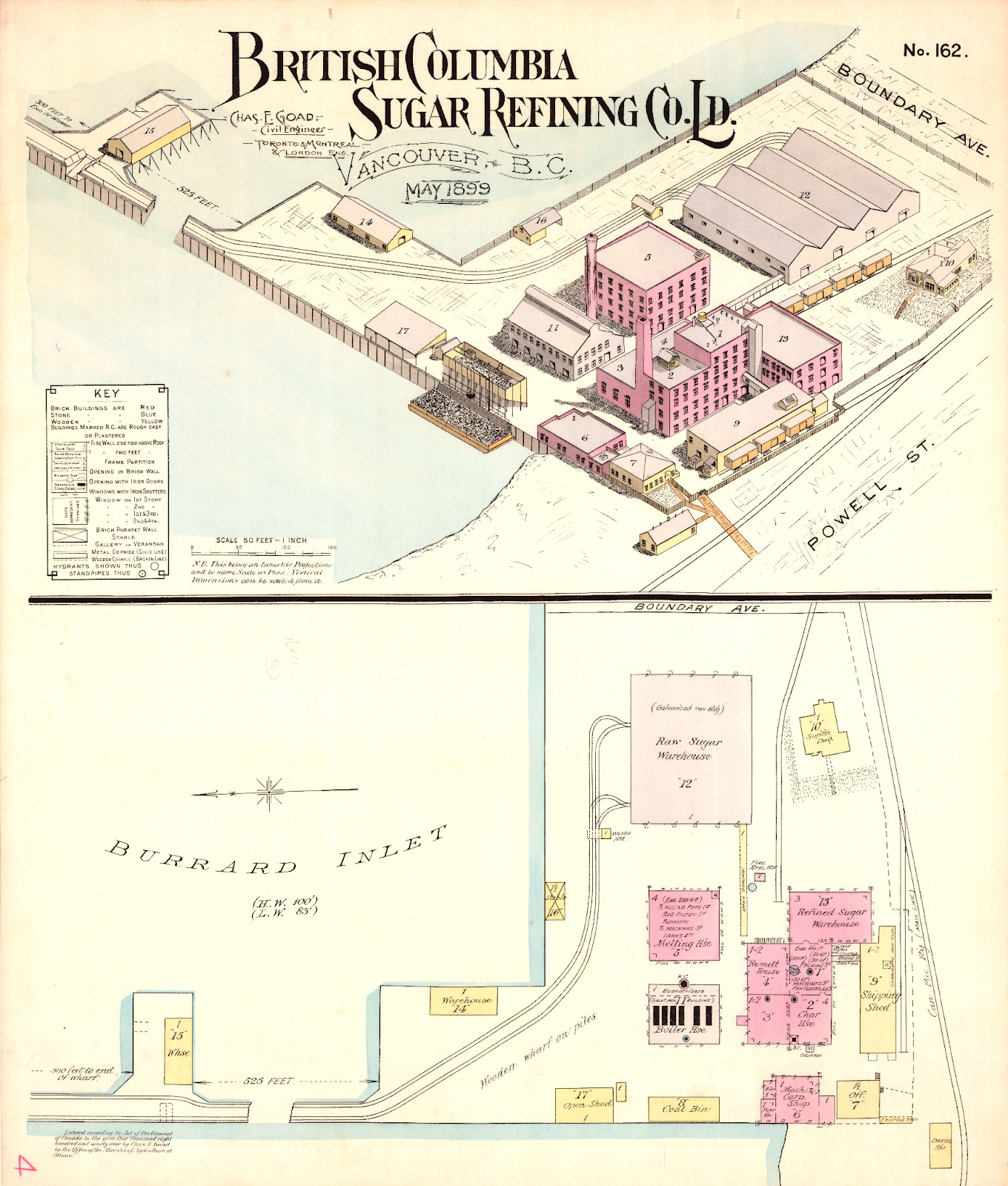 British Columbia Sugar Refining Co. Ld., Vancouver, B.C., May 1899, cartographic material, attributed to Charles E. Goad, Civil Engineer, Toronto, Montreal, and London, British Columbia Sugar Refining Company fonds, engineering and maintenance records, City of Vancouver Archives, reference code AM1592-S8-: 2011-092.0113.